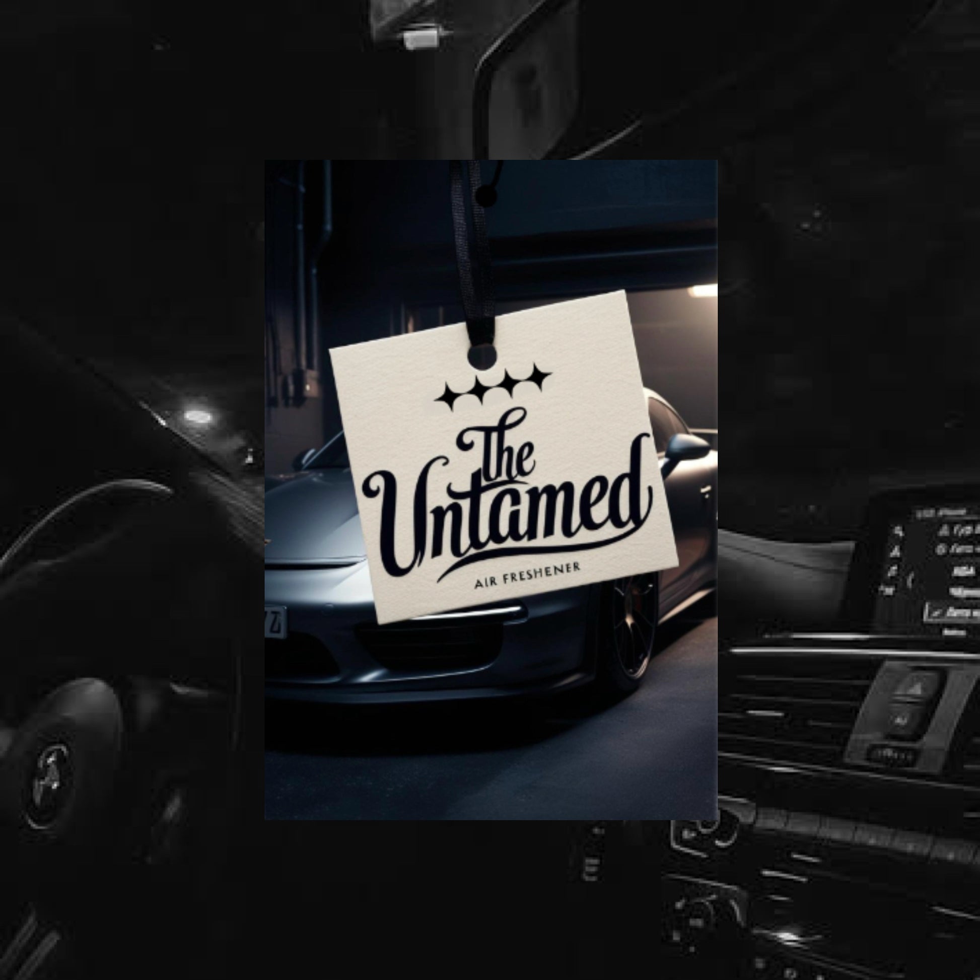 Introducing The Porshe, a premium air freshener featuring the iconic untamed logo and a sleek Porshe car design in the background. Elevate your driving experience with the highest quality fragrance and stylish design. Freshen up your car with The Porshe today.